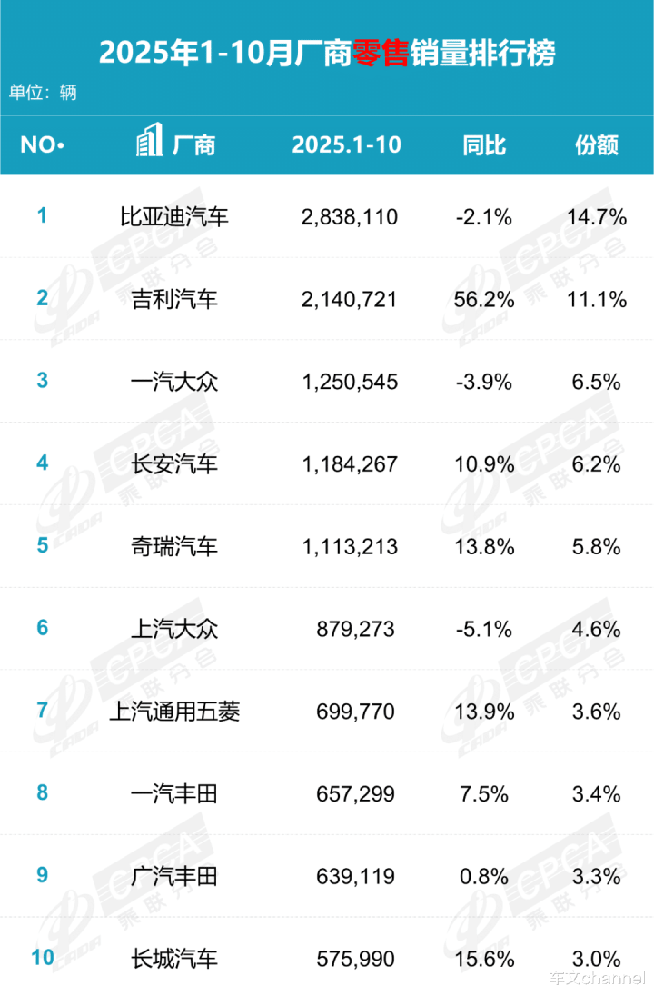 根据乘联会最新数据,2025年1-10月厂商零售榜单中(侧重于国内市场实际销量),吉利汽车累计销量214万辆,仅次于比亚迪名列第二,销量同比增速56.2%,整体市占率达到11.1%。